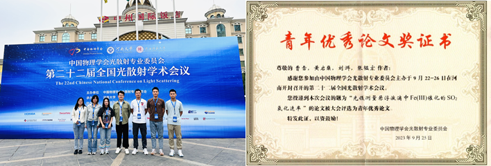 博士生曹雪的“光镊测量悬浮液滴中Fe(III)催化的SO2氧化速率”青年论坛报告,获得了优秀青年论文奖。