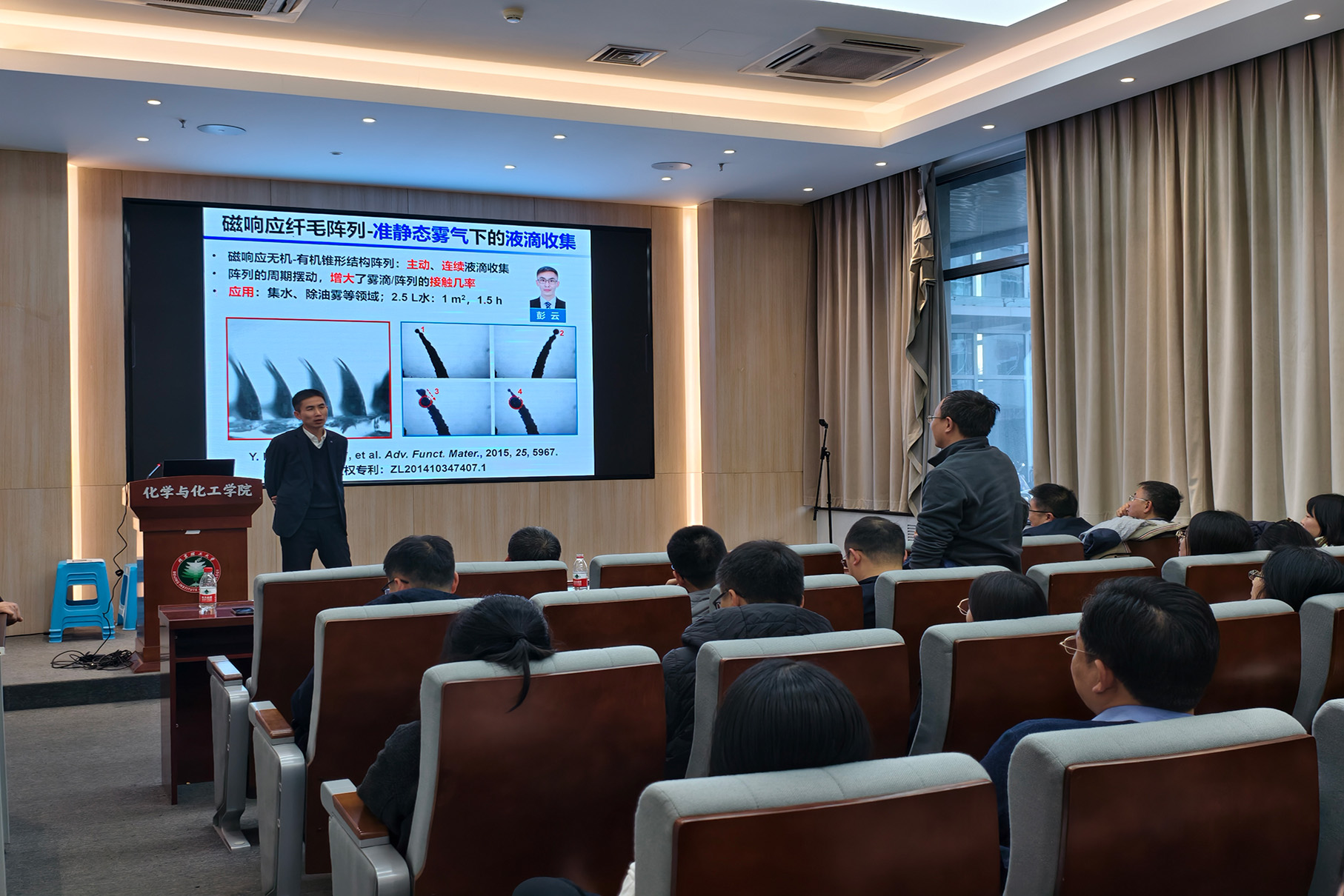 刘克松教授首先介绍了向自然学习是构筑新材料和新器件的重要途径,课题组多年来一直致力于微纳米多尺度结构的仿生构筑和浸润性调控,取得了显著进展。刘克松教授详细介绍了课题组在多个领域的研究成果。首先该团队发展了系列仿生超浸润界面功能材料体系,并成功实现了界面流体的智能输运。其次设计出了新型医疗输液管,能够有效防止血液回流,从而显著降低医疗事故的风险。此外该课题组通过调控电极反应界面浸润性与微纳多尺度结构,成功构筑系列超疏油电极,优化了电化学反应三相界面的效率和稳定性,显著降低了电化学合成过程中产物的界面粘附,提升了Kolbe电化学反应的工作效率。