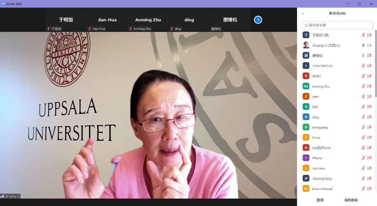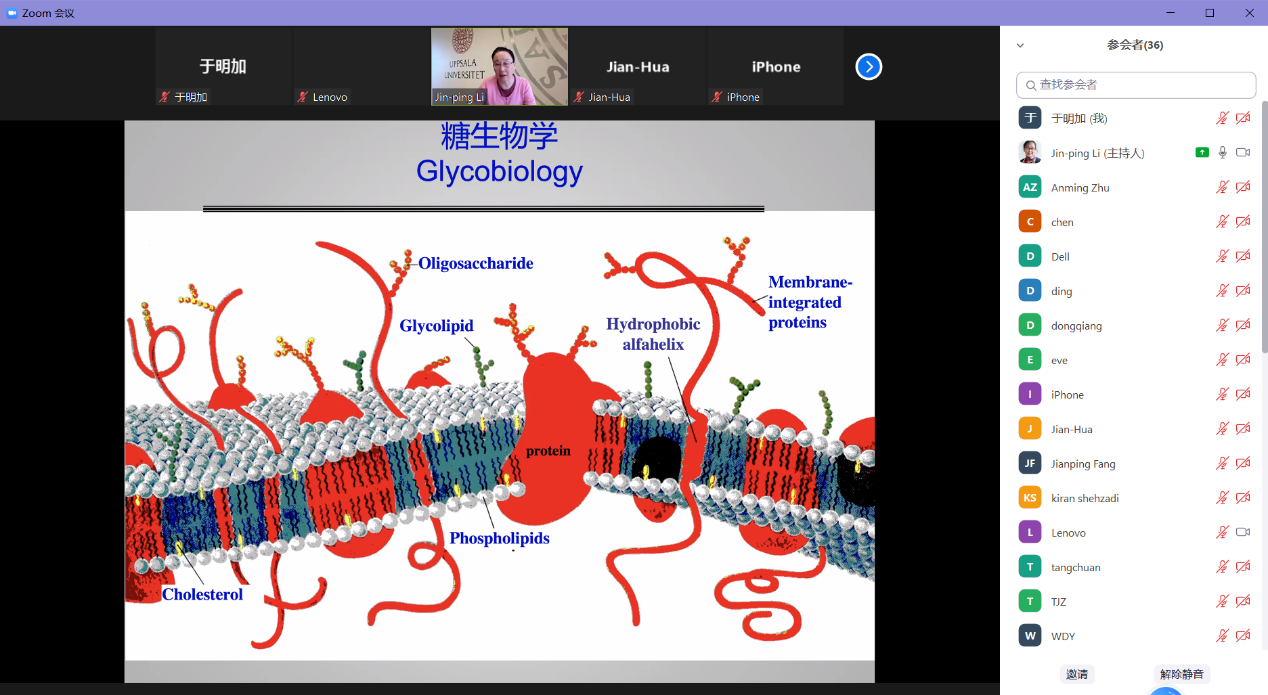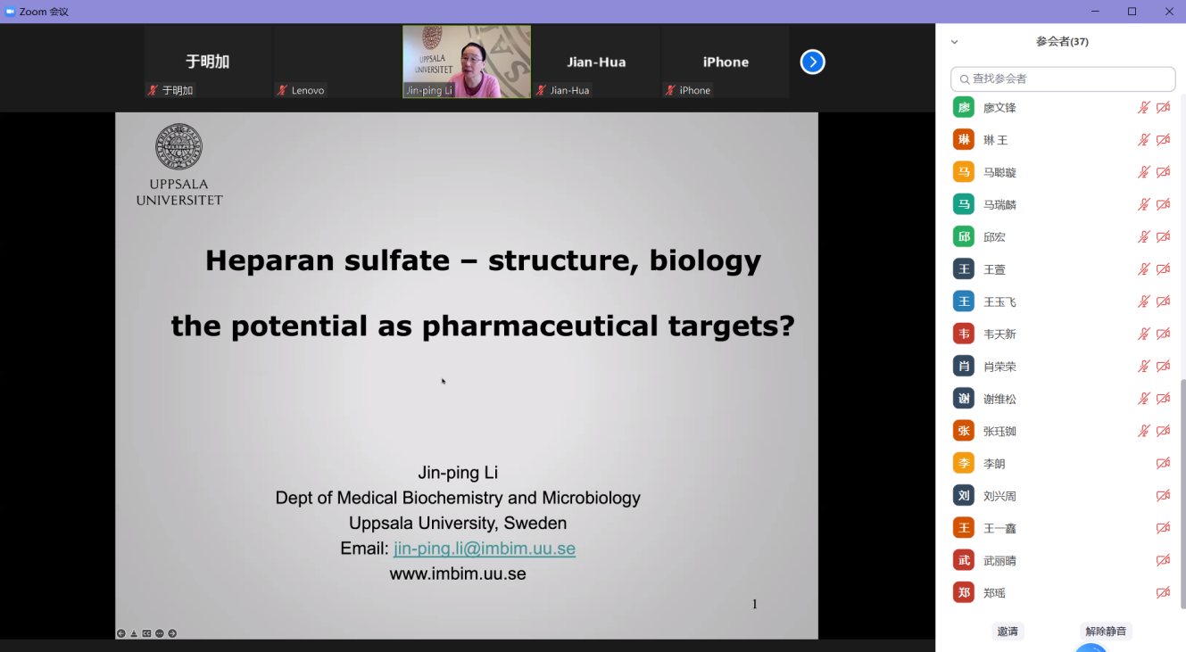 2022年4月25日下午2:30,应日本A片 梁建华教授邀请,乌普萨拉大学医学院李晋萍教授做客日本A片 “21世纪学科前沿”系列讲座,为我院广大师生带来题为“Heparan sulfate- structure, biology the potential as pharmaceutical targets”的精彩学术报告。本次报告以Zoom会议线上的方式进行,由于明加特别副研究员主持,学院师生共40余人参加。