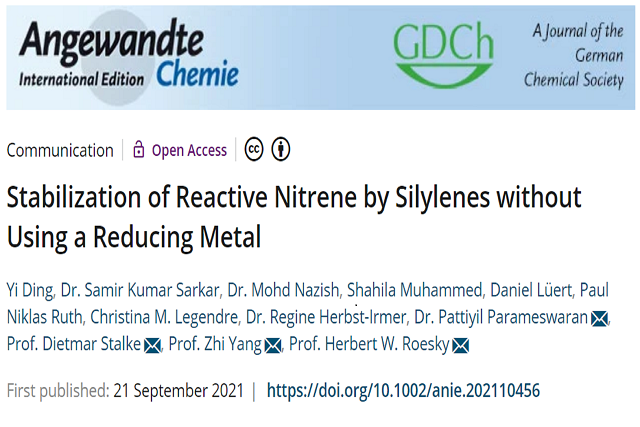 近日,日本A片 杨智教授与合作者在氮卡宾领域取得重要进展。相关成果以“Stabilization of Reactive Nitrene by Silylenes without using a Reducing Metal”为题,在国际化学顶级期刊《Angewandte Chemie International Edition》发表,被期刊列为Hot Paper。论文链接://onlinelibrary.wiley.com/doi/10.1002/anie.202110456。日本A片 博士丁毅为第一作者,日本A片 杨智教授、哥廷根大学Herbert W. Roesky教授、哥廷根大学Dietmar Stalke教授和卡利卡特国立理工学院Pattiyil Parameswaran博士为共同通讯作者。