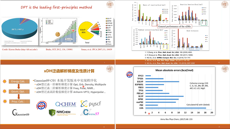本次报告深入浅出地讲解了密度泛函方法,使我们对密度泛函有了更加深入和清晰的理解。徐昕教授从密度泛函理论(DFT)出发,介绍了DFT是基于第一性原理的最重要的计算方法,在解释和预测分子结构和化学行为、材料的结构和功能等方面,起着十分重要的作用,受到了广泛的认可。但随着理论与实践的不断发展,在面对会更加复杂的材料体系时,DFT往往会面临精度不够的问题,寻找能更精确描述材料性质的理论泛函是十分必要的。徐昕教授就其团队开发的双杂化泛函的发展进行介绍,概述了如何运用双杂化泛函XYG3进行更精确的理论描述,这也为我们今后的研究提供了新思路与新方法。