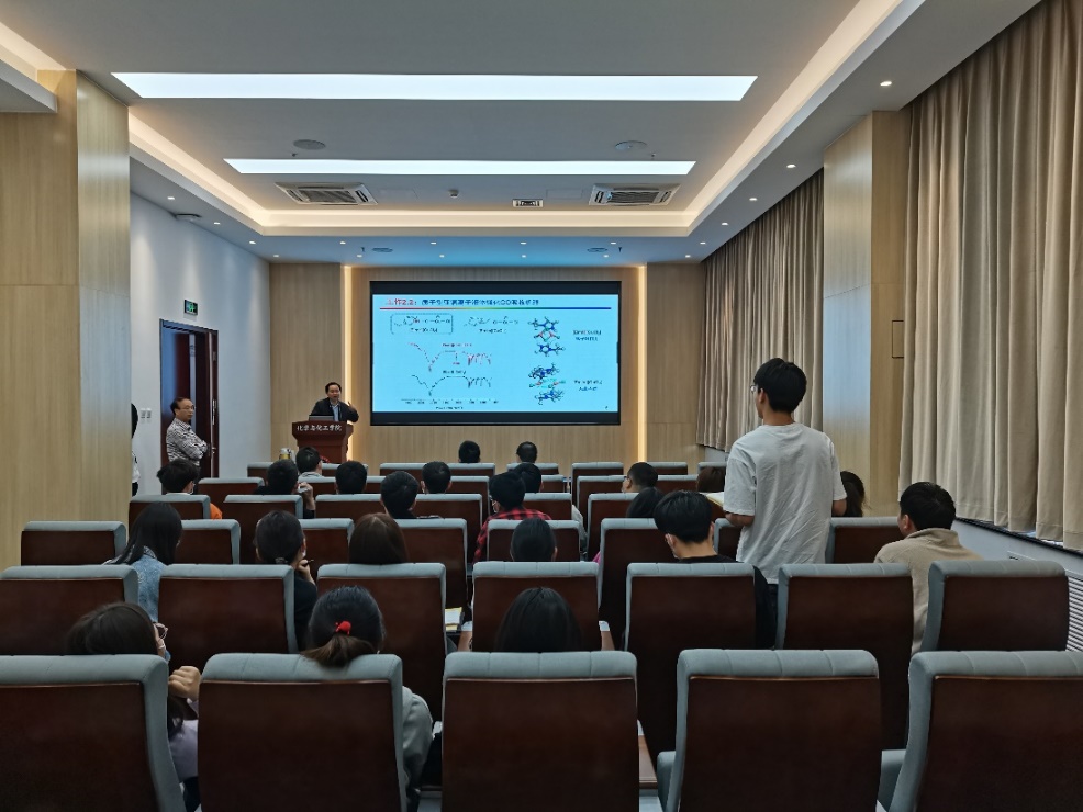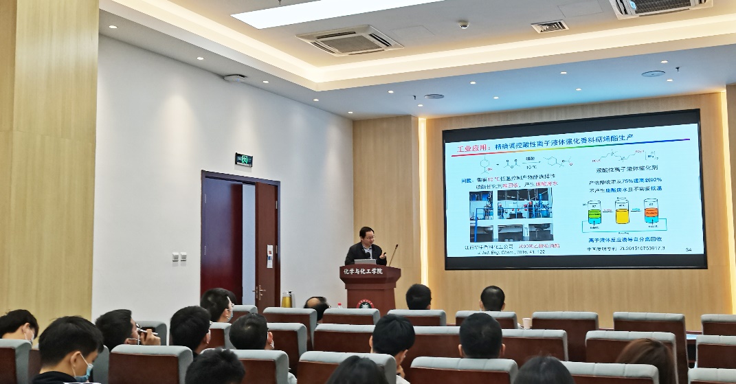 学术报告中,陶端健教授深入介绍了其研究团队以调控离子液体微环境,强化传质分离过程为策略,在面向国家重大需求-化工分离节能减排方面的研究进展。在基础研究方面,陶教授重点从提升体系的溶解性、选择性、扩散传质、吸附容量等角度出发,通过精准调控离子液体酸碱度、粘度和氢键等微环境,实现了对难分离体系的高容量、高选择性和快速的吸收分离。具体内容包括通过调控质子位点合成了一系列质子型离子液体并确定了离子液体结构与粘度、酸碱度之间的半定量关系 (Green Energy Environ., 2019, 4, 49; Ind. Eng. Chem. Res., 2018, 57, 6654)。通过制备低粘度质子型离子液体,强化了CO/N2SO2/CO2难分离物系选择性吸收和分离(Angew. Chem. Int. Ed., 2016, 55, 7166; Angew. Chem. Int. Ed., 2017, 56, 6843; Chem. Eng. J., 2020, 394, 124859)。在工业应用方面,陶教授介绍了复合质子型离子液体强化提高乙酸乙酯传递通量,设计制备了流程简单、分离能耗低、设备腐蚀小的反应萃取精馏强化分离乙酸乙酯新工艺。此外,陶教授还介绍了精确调控酸性离子液体强化香料萜烯酯的生产工艺。在报告会交流环节中,参会师生就报告内容与陶教授进行了深入且细致的探讨,现场交流和讨论气氛热烈,与会师生收获颇丰。
