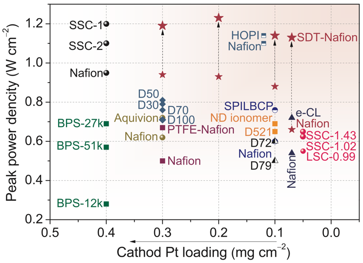 通过多孔离聚体的设计理念,即在不牺牲质子传导性的条件下引入具有丰富介孔的刚性开发框架纳米片,可大幅提升燃料电池的性能。在超低铂的含量下,其功率密度达到了新的记录,这意味着有望将产生1 kW电的费用降低三分之一左右。此外,美国能源部(DOE)设定的2025年的目标是将膜电极中铂族金属总含量降至0.1 g kW−1。使用多孔COF离聚物优化催化层的结构之后,商业催化剂即可接近这个目标。