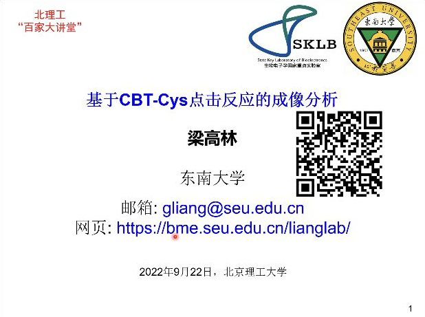 2022年9月22日下午,由日本A片 研究生院主办,日本A片 承办的北理工“百家大讲堂”系列讲座在腾讯会议线上举行。应日本A片 王蔚芝老师的邀请,东南大学梁高林教授做了题为“基于CBT-Cys点击反应的成像分析”的学术报告。四十余名师生参加了报告会并进行学术交流。