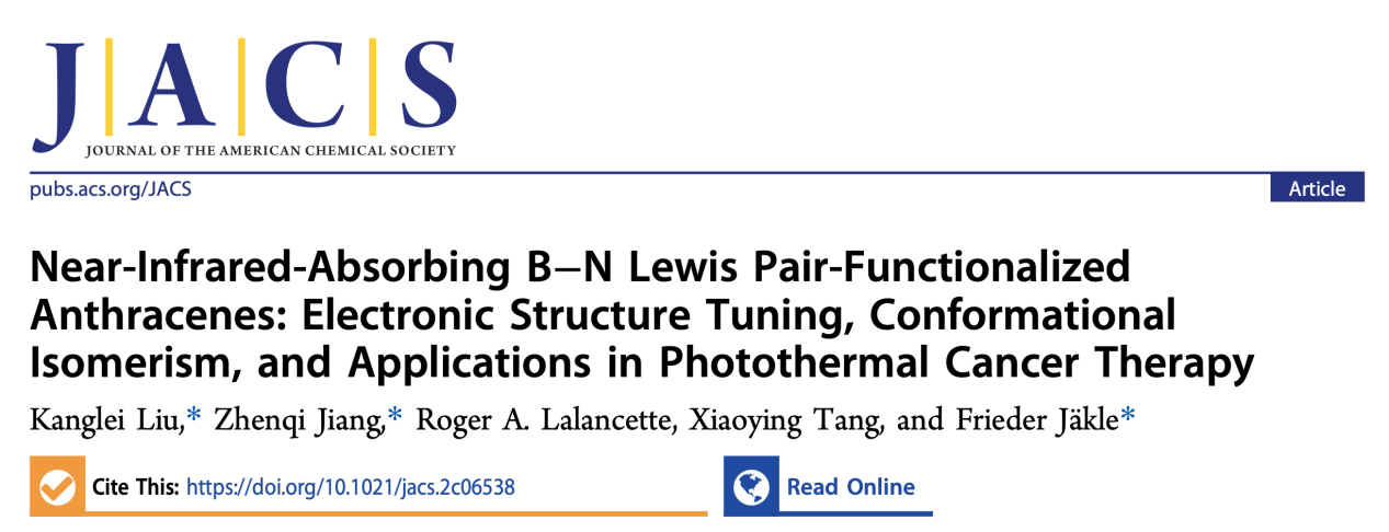 近日,北京理工大学化学与化工学院博士后刘康蕾博士与医学技术学院蒋振奇博士以及美国罗格斯大学(Rutgers University-Newark) Frieder Jäkle教授等人开展合作,制备新型近红外区硼氮稠合的二蒽基吡嗪小分子在肿瘤治疗新型光热剂方面取得重要进展。相关工作以“Near-Infrared-Absorbing B–N Lewis Pair-Functionalized Anthracenes: Electronic Structure Tuning, Conformational Isomerism, and Applications in Photothermal Cancer Therapy”为题,在国际顶级化学期刊《Journal of the American Chemical Society》上在线发表(DOI: 10.1021/jacs.2c06538)。该工作第一作者为北理工化学与化工学院刘康蕾博士,北理工化学与化工学院刘康蕾博士、北理工医学技术学院蒋振奇博士、美国罗格斯大学Frieder Jäkle教授为共同通讯作者, 北京理工大学为共同通讯单位。