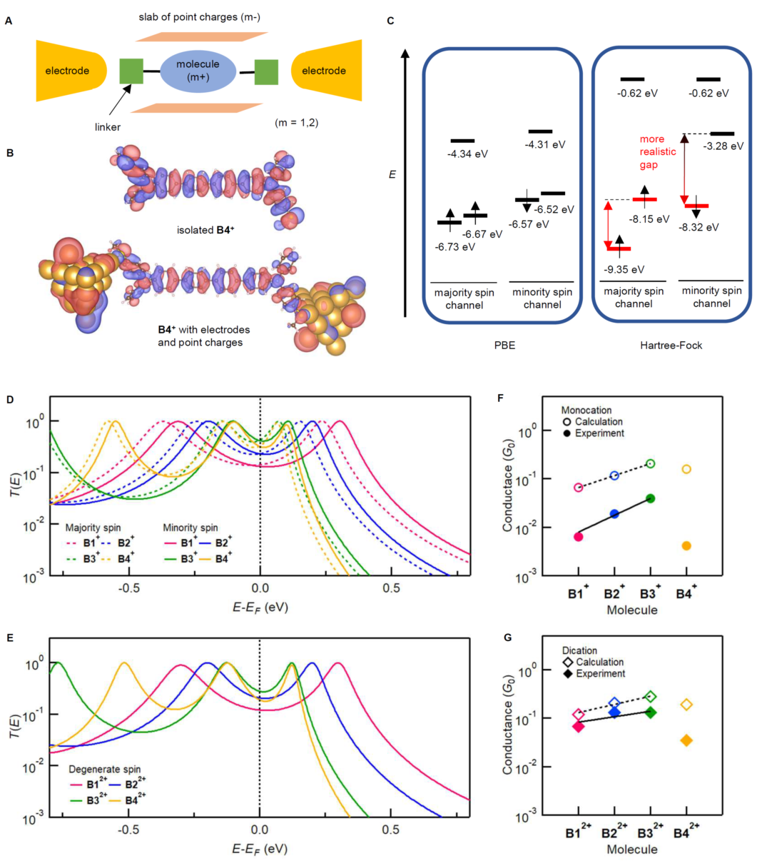 北京理工大学化学与化工学院的尹晓东特别研究员一直以来对于具有氧化还原活性的有机分子在单分子电子学上的性质和应用有着浓厚的兴趣。在美国进行博士后研究期间就与美国哥伦比亚大学 (Columbia University) 的Latha Venkataraman教授和Luis M. Campos教授合作发表关于氧化还原调控分子芳香性从而导致电导大幅增加的研究成果 (Science Advances, 2017, 3: eaao2615)。而在本工作中,尹晓东特别研究员与Venkataraman教授,Luis M. Campos教授以及德国雷根斯堡大学 (University of Regensburg) Ferdinand Evers教授等人开展合作,系统研究了一系列含有低聚苯桥的双(三芳基胺)分子导线在电中性,一价和二价阳离子状态的单分子电学性质。相关工作于近期发表在化学类国际顶级期刊Nature Chemistry上 (Nat. Chem. 2022,10.1038/s41557-022-00978-1)。